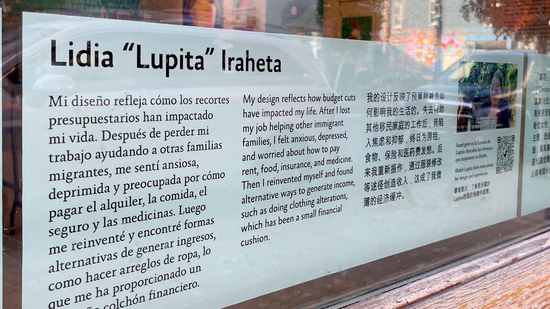 The trilingual exhibition (English, Spanish, and Chinese) includes statements and links to video interviews. Audiences can see and hear all 15 collaborating designers speaking in her native language about the stories behind her papercut, and her reflections on the process.
